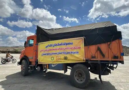 کاروان حامل کمکهای اهدایی شرکت توسعه معادن پارس تامین با هدایت محمدنبی نوری مدیرعامل شرکت توسعه معادن پارس تامین به مناطق سیلزده در جنوب استان سیستان و بلوچستان رسید و محمولهخود را میان سیلزدگان توزیع