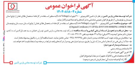 شرکت توسعه معادن پارس تامین در نظر دارد تامین الکتروموتور 900 کیلووات (Low Voltage) به منظور استفاده در کارخانه استحصال طلای تفتان از توابع استان سیستان و بلوچستان را از طریق فراخوان عمومی شناسایی به شرکتهای واجد صلاحیت واگذار نماید.