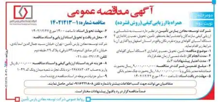 شرکت توسعه معادن پارس تامین در نظر دارد نسبت به شناسایی و ارزیابی کیفی سازندگان واجد شرایط به منظور تامین، تحویل، نصب و راهاندازی 2 دستگاه آسیای گلولهای پروژه نقره رنگان واقع در استان اصفهان و واگذاری آن با شرایط زیر اقدام نماید.