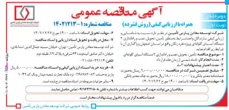 شرکت توسعه معادن پارس تامین در نظر دارد نسبت به شناسایی و ارزیابی کیفی سازندگان واجد شرایط به منظور تامین، تحویل، نصب و راه‌اندازی 2 دستگاه آسیای گلوله‌ای پروژه نقره رنگان واقع در استان اصفهان و واگذاری آن با شرایط زیر اقدام نماید.