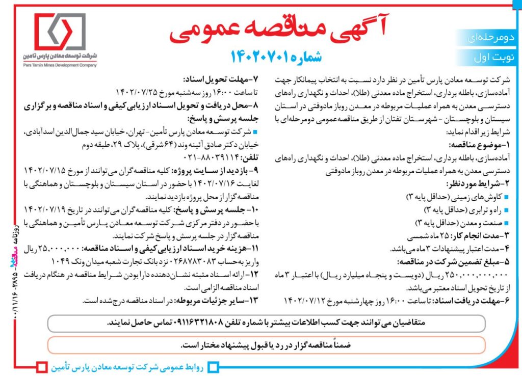 شرکت توسعه معادن پارس تأمین در نظر دارد نسبت به انتخاب پیمانکار جهت آماده‌سازی، باطله‌برداری، استخراج ماده معدنی (طلا)، احداث و نگهداری راه‌های دسترسی معدن به‌همراه عملیات مربوطه در معدن روباز مادوفتی در استان سیستان و بلوچستان – شهرستان تفتان از طریق مناقصه عمومی دو مرحله‌ای با شرایط زیر اقدام نماید :