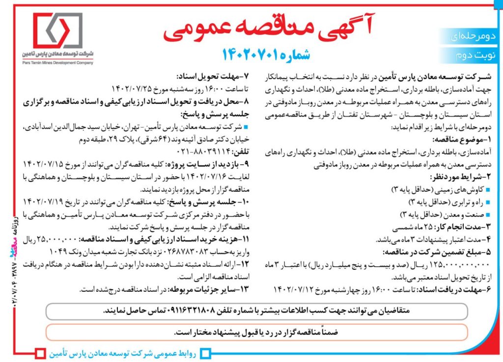 شرکت توسعه معادن پارس تأمین در نظر دارد نسبت به انتخاب پیمانکار جهت آماده‌سازی، باطله‌برداری، استخراج ماده معدنی (طلا)، احداث و نگهداری راه‌های دسترسی معدن به‌همراه عملیات مربوطه در معدن روباز مادوفتی در استان سیستان و بلوچستان – شهرستان تفتان از طریق مناقصه عمومی دو مرحله‌ای با شرایط زیر اقدام نماید :