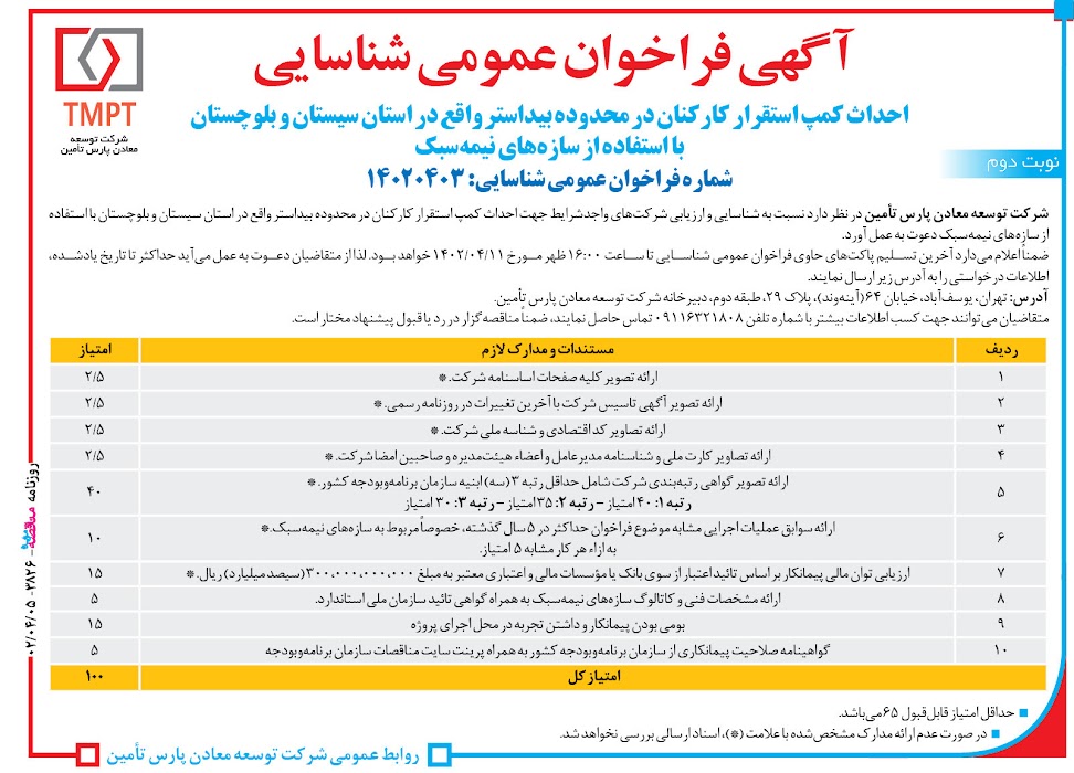 آخریت تسلیم پاکت های حاوی فراخوان عمومی شناسایی تا ساعت 16 ظهر مورخ 1402/04/18 خواهد بود، لذا از متقاضیان دعوت به عمل می آید حداکثر تا تاریخ یاد شده اطلاعات درخواستی را به آدرس زیر ارسال نمایند.