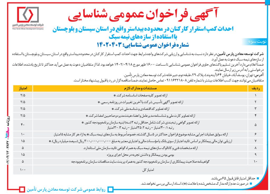 آخریت تسلیم پاکت های حاوی فراخوان عمومی شناسایی تا ساعت 16 ظهر مورخ 1402/04/18 خواهد بود، لذا از متقاضیان دعوت به عمل می آید حداکثر تا تاریخ یاد شده اطلاعات درخواستی را به آدرس زیر ارسال نمایند.