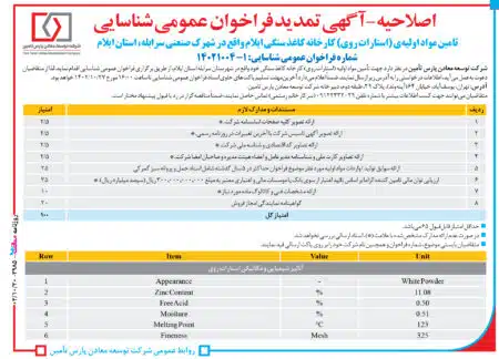 اصلاحیه – آگهی تمدید فراخوان عمومی شناسایی تامین مواد اولیه‌ی (استارات روی) کارخانه کاغذ سنگی ایلام واقع در شهرک صنعتی سرابله، استان ایلام