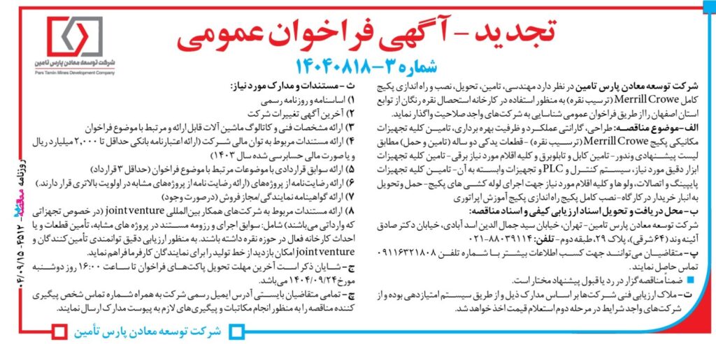 شرکت توسعه معادن پارس تامین در نظر دارد مهندسی، تامین، تحویل، نصب و راه اندازی پکیج کامل Merrill Crowe (ترسیب نقره) به منظور استفاده در کارخانه استحصال نقره رنگان از توابع استان اصفهان را از طریق فراخوان عمومی شناسایی و به شرکتهای واجد صلاحیت واگذار نماید.